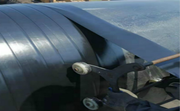 聚乙烯防腐膠帶動力機具纏繞防腐膠帶時,將鋼管放置于由能夠可減速裝置電動機帶動承載鋼管的橡膠輪上,開動傳動裝置,讓鋼管勻速轉動。用電動鋼絲刷除銹,滾刷底漆后將防腐膠帶放置放卷小車的放卷軸或手持放卷軸,按搭接要求慢慢向前行進,保持勻速和漲力,逐圈纏繞聚乙烯防腐膠帶。
