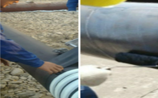 4.待底漆表干后(在常溫及空氣自然流動狀況下,一般需要3~5分鐘,即可纏帶。應(yīng)特別注意溫度低時或在溝槽施工時的表干時間,確保鋼管下半部分表干。