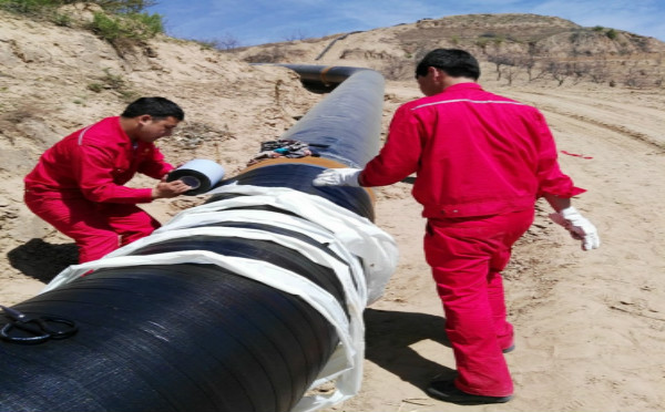 3、纏繞聚丙烯防腐膠帶待底漆表干后即可進行,繞帶過程中必須保持均勻漲力,纏平貼實、搭接一致,纏好膠粘帶后,在埋地前為克服造成起泡現象,需將防腐管道采取遮陽保護的方法掩蓋24小時。