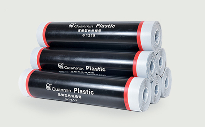 壓敏膠熱收縮帶, 又名:熱烤壓敏帶、壓敏型熱縮帶、壓敏膠熱收縮帶、熱縮壓敏帶、壓敏熱縮帶。是一種由輻射聚乙烯膜片,與新型的丁基橡膠不溶性彈性體膠粘劑通過復合工藝制成的帶狀熱縮防腐蝕材料。